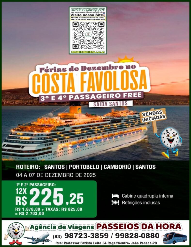 Férias de Dezembro no COSTA FAVOLOSA – 3º E 4º PASSAGEIRO FREE