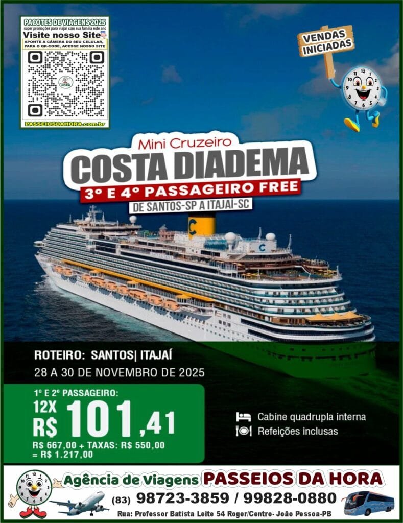 Mini Cruzeiro COSTA DIADEMA – 3º E 4º PASSAGEIRO FREE